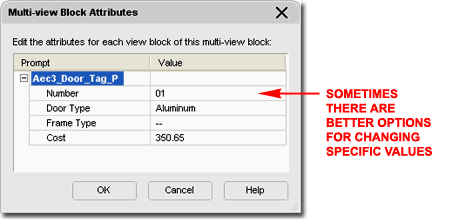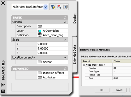 On the Multi-view Block Attributes dialog box for a Tag Object, you should find a list of all the editable Attributes for that Tag. Do not confuse the Attributes with the Data though some Attribute information is often included in Schedules. Attribute information is usually for the text that you want to display within the Symbol as is the case with most AutoCAD Block Attributes. Some of the default Object Tags, such as the Door Tag discussed above and to the right, offer additional Attribute fields that can be included in the Schedule or other forms of extracted data. These extra fields provide the option to include information that is unique to each Object though it may be part of the same Object Style; i.e., two identical Doors but labeled with different Tag Numbers. In some cases, such as the Tag Numbers on Doors and Windows, using the "AecPropertyRenumberData" command may prove to be a much better option for Modifying the numbers. |