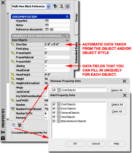 When it comes to Modifying Object Tags, the serious topic begins on the Extended Data tab of the Properties Palettes. Though most Objects have Property Data Sets assigned at the Style Level, sometimes you may create one where you forgot to Add any Property Sets. In cases like this you may notice that information is missing in your Schedules ( often expressed by a "?" ). You will also find that the Data you are looking for will not be listed on the Extended Data tab of the Object Properties Palette. Property Data Sets can always be Added or Removed from Objects, as illustrated to the right, as long as Property Data Definition Styles exist in the current drawing and that they can be applied to the Selected Object; i.e., not all Property Data Definition Styles can be applied to all Objects. One rather interesting and helpful feature in ADT regarding Property Data Sets is that the act of Tagging an Object usually results in the Attachment of one or more Data Sets as well so if you find that you have Doors, for example, that don't have their Property Data Sets Added on the Extended Data tab, you may want to Tag them before attempting to Add the Sets Manually. Tags will Attach Property Data Sets to Objects but you may want more Data than what the Tag brings to the Object and in cases like that you may have to Add it manually. How you manage your Schedules, the Data you want in them and any other Data you may want to extract to Spread Sheets, will determine when and where you will Add the Property Data Sets. Obviously the most effective place to Attach this Data is at the Style Level but that also assumes you have the foresight to prepare your Property Set Definition Styles proper to starting your project. Fields with a lightening bolt before them cannot be edited because the Data is extracted directly from the Object or Object Style. Fields that have lightening bolts with other