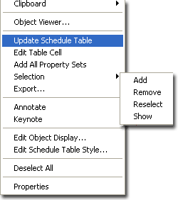 Yes/No drop-down list option to allow for Manual Maximum Height - use this value field to indicate the maximum column height allowed before a Break is to occur. Since numerous other factors, such as Text Height, affect the total Schedule Table height, use this value as an approximation to be rounded down. The height must be entered in "real world" units that are automatically multiplied by the "Scale" value under the General Section. Spacing - use this value field to indicate how far apart you want the broken Schedule Table segments. As with the Maximum Height value, enter this in "real world" units that will be multiplied by the Scale value. Illustrated to the left I show the object-specific pop-up menu and the options you have for a Schedule Table Object. In addition to these options, you will find that you can also do some modifications by using Grips. |