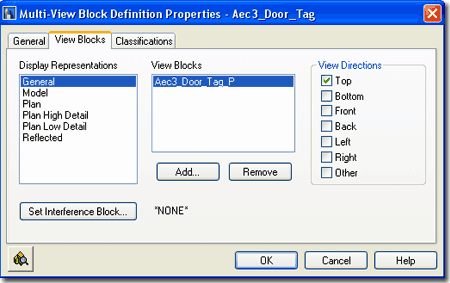 Another Modification option that is available from the object specific pop-up menu is "Edit Multi-view Block Definition..." You can read up on this subject under Multi-view Blocks but I included the topic here because you may find that some Tags don't appear when you want them to and this may be a quick fix that you will need to know about. If you have one or more Tags that don't display for the Reflected Display Representation or vice-versa, for example, you can use the Add... button to Add the Block Name for the Display Representation you want and set the View Directions to Top. This Modification will affect all of the same Tags in the current drawing.