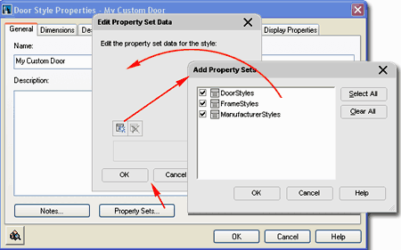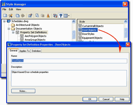 Definitions For Property Set Definition Styles you can use the Style Manager to load, modify, delete and create new Property Set Definition Styles. Illustrated to the right, I show the process of Modifying an Existing Property Set Definition Style: DoorObjects. By double-clicking on this or any style, you will invoke the Property Set Definition Properties dialog box - as illustrated. In the steps below I will discuss how to make changes to this Style as a basis for helping you modify other Styles or create your own from Scratch. The General tab provides access to the Name and Description fields for a Style; plus access to the attachment of Notes. What Are They? |