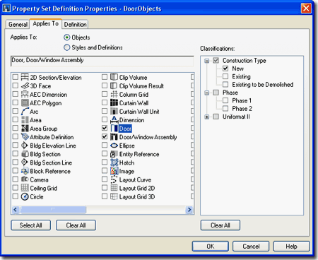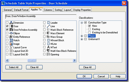 On the Applies To tab of the Schedule Table Style Properties dialog box, you set the Object Types your Schedule will be reporting on. You can select several objects or just one since the information put in your Schedule Table is filtered by the Columns tab. If you don't know exactly what Object to Apply To, it's okay to select several. In fact, you can use the Select All button and just let it have the potential to read all objects but you may find this a mess with more complex Schedule Tables. You cannot leave it blank, if you Clear All and come back, you will see that everything gets checked, so you have to have at least one object checked. Notice that for the default Door and Window Schedule Table Styles, that Door/Window Assembly Objects have been included. This means that Door and Window Assemblies could potentially be list in either a Door or Window Schedule Table ( or even both ). If you Insert Doors or Windows in your Assemblies, you can actually Schedule them separately from the Door and Window Assembly. CLASSIFICATIONS: |