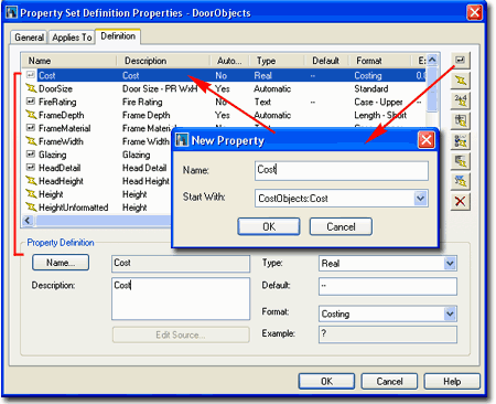 The Definition tab of the Property Set Definition Properties dialog box, illustrated to the right, is where all of the magic for data collection and management occurs. This subject can get a little overwhelming at first but once you see the correlation between Property Names, Data Sources, Formatting, Objects and Schedules it gets a little easier to comprehend. Illustrated to the right I show how you can use the New Property Button to Add a Cost Property by using the CostObjects Property Set Definition Style as a source to Start With. You don't actually need the CostObjects Property Set as a source to Start With but it can be useful to save time in setting the Property Definition Settings such as Type, Default and Format. In my example to the right, I set the Type to Real numbers, the Default value to "--" since I don't have a default Cost and the Format to "Costing" (if you don't have this Format, create one - Property Data Format Styles ). |