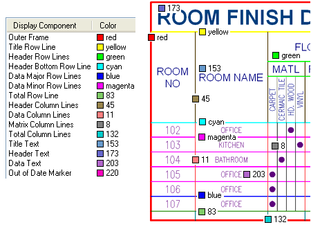 Properties - Schedule Table - Component Layers Illustrated to the right I show all but one of the Display Components that you will find on the Layer/ Color/ Linetype tab of the Display Properties dialog box discussed above. Not all Display Components are used in all Schedule Tables. Total Row Line and Total Column Lines will only appear if you have added a Totals Column to your Schedule Table Style. Components like Header Bottom Row Line and Data Major Row Lines offer the option to control specific row lines uniquely but you don't have to set their Properties uniquely if you don't want them to appear any different from the Data Minor Row Lines. The Data Major Row Lines will appear at intervals of five rows and I could find no way to alter that setting (I believe it is hard-coded that way). I still have not found an example of the Out of Date Component Display Component so that's why I don't have a graphic example for that Color. |