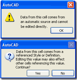 When you use this tool, notice the command line options: "Select schedule table item (or the border for all items), hover for information, or CTRL-select to zoom:" The Zoom option can be quite useful when attempting to figure out which Object you are editing. Some Cells cannot be edited because they acquire their data automatically from the Object itself, such as sizes and you will need to Modify those Objects directly in order to make the change in the Schedule Table. Some Cells may produce a warning that Editing the Data will affect other cells and this simply means that you are editing Data from the Style Level rather than the Object Level. In other words, it is okay to proceed but you will probably see a lot of Cells change to match your single change - see Dialog Alerts to the left.