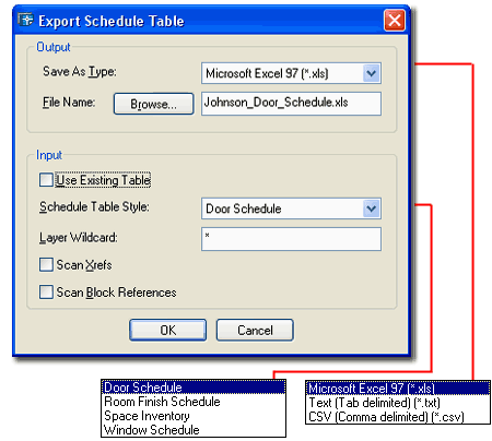 For Exporting Schedule Table Data to an external format, you can either Export a Table in the current drawing file or create a new one based on the Input settings on the Export Schedule Table dialog box illustrated to the right. To Export an existing Schedule Table that is in the current drawing, simply Select it, right-click and Select the Export... option off the Object-specific pop-up menu. This method will no allow you to use the Input options should you decide to change your mind about what to Export. To Export a new Schedule, use the TableExport command which will allow you to use the Input area of the Export Schedule Table dialog box. The options under Input are identical to those found on the Properties Palette when Adding a Schedule Table. If you use the "Use Existing Table" checkbox, you will be queried to "Select existing schedule to export" and the result is identical to Exporting a Selected Schedule Table as discussed above. OUTPUT File Name - this is just the common Save As... file name and location option so provide a name and a location on your system or Network and go. INPUT |