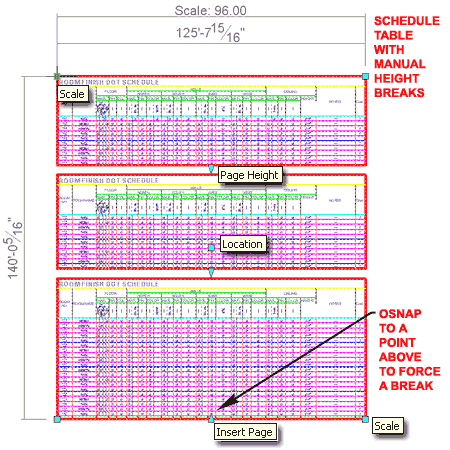 Editing Schedule Tables with Grips is not only quite limiting but should rarely be done. For Sizes, Schedule Tables are set by a Scale factor and you can modify the Scale Value on the Properties Palette. Other Sizes, such as those for Cells, you will need to work with the Schedule Table Style and set a Fixed Width Cell Size Override. Illustrated to the right I show an example Schedule Table with a Manual Height Table Break because this provides one extra Grip Point: Insert Page. In addition to the Insert Page Grip which can be used to create manual Table or Page Breaks, you can use the Page Height to adjust Breaks that have already been made.