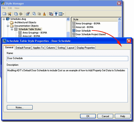 For Schedule Table objects, you can use the Style Manager to load, modify, delete and create new Schedule Table Styles. Schedule Table Styles are found under the Documentation Objects folder of the Style Manager. Illustrated to the right, I continue the discussion of adding a Cost Property to Doors by showing how to add the Cost Property as a Column to the default Door Schedule. Though you may never use this example, keep in mind that it exemplifies how to Add all sorts of Property Data to your Schedules. As with all other Styles in ADT, you can create a New Schedule Table Style from scratch by using the New Style button. You can also use Copy and Paste to create a Copy of an existing Schedule Table Style and use that Style as the source for your new custom version. The General tab provides access to the Name and Description fields for a Style; plus access to the attachment of Notes. |