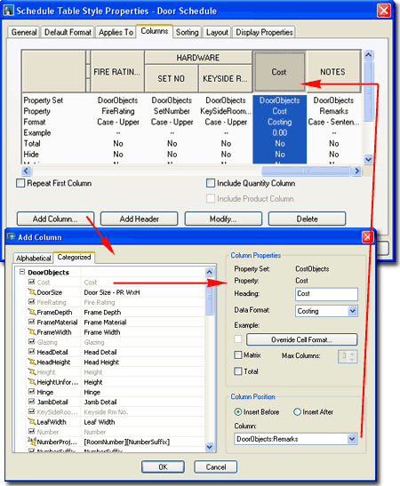 On the Columns tab of the Schedule Table Style Properties dialog box, you configure the Columns and Rows of your Schedule Table by linking Cells to Property Set Data. If you have ever worked with Excel, this is little more than linking one Cell to another Cell in another Book where some Product is derived. Working with the Columns tab of the Schedule Table Style Properties dialog box can be fairly complex and I doubt that I can cover all of the possible options with a couple of screen captures but I can try to provide you with enough of an overview that you can venture into this realm on your own. Illustrated to the right I show that I used the Add Column... button to access the Add Column dialog box illustrated to the lower right. Once on the Add Column dialog box, I show that I found the Cost Property Data that I Added to the DoorObjects Property Set earlier in this discussion. After Selecting the example "Cost" Property Data, I show that I have a few control options on how I want this Data presented in my Schedule Table and where I want the Column for this Data inserted. If you make a mistake on the Column Position or you simply want to move the Column, you can drag the Column Header to a new position on the Columns tab.