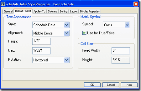 Properties - Default Format tab On the Default Format tab of the Schedule Table Style Properties dialog box, you set the primary values for the Text and Symbols in your Schedule Table. Though this provides only one control for all the text in a whole Schedule Table, you can set Overrides on the Layout tab Title, Column Headers and Matrix Headers. Use this tab to set the desired values for the general body of text within the Schedule Table.
