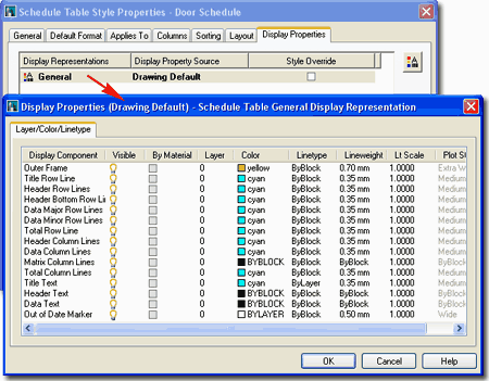 The Display Properties tab of the Schedule Table Style Properties dialog box, illustrated right, provides access to line and annotation display controls. Schedule Table objects are obviously quite different from other typical ADT object types and thus offer a set of options appropriate for a Schedule Table. Illustrated to the right I show the Layer/Color/Linetype tab of the default "General" Display Representation for any Schedule Table Style in ADT. By default you may find all sorts of Color Settings on this tab but I changed my example to use more basic Colors to match how I work. Since you cannot use "By Material" to control how Schedule Tables appear, you will need to use Colors, Lineweights or Plot Style Tables Names.