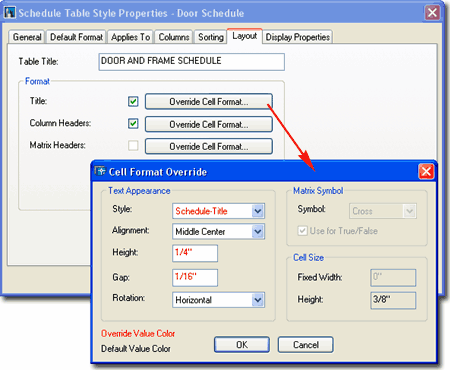 | Style Properties - Layout tab On the Layout tab of the Schedule Table Style Properties dialog box, you provide a Table Title and have the option to use Overrides on the Formatting of text and numbers in the Schedule Table. If you recall, the Default Format tab, discussed above, was used to set the general Font and Symbol Formatting but only allowed for one Format Setting. By using Overrides, you can control how you want other items Formatted.