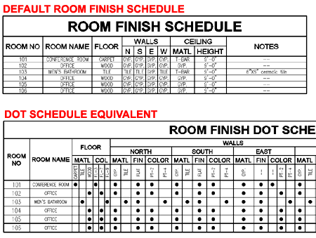 Schedule Using a similar approach to Adding Door Schedule Tables, you can Add other Schedule Tables such as the Room Finish examples illustrated to the right. Room Finish Schedule Tables are rather impressive if you happen to have all of the data filled out for all of the Space or Area Objects that define your rooms. This can proved to be a tedious task and one alternative to working on each Object is to Add the Schedule Table, Select the Objects and then fill in the missing Cells by using the TableCellEdit command. The best solution for filling out Room Finish Schedule Tables is to design Space or Area Objects that already have most, if not all, of the data completed. For standardized commercial work this is easier to accomplish than with custom residential work. |