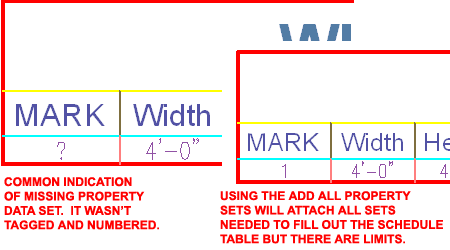 The Add All Property Sets tool serves as a quick fix for resolving problems with Objects and Object Style that don't have Property Sets Added for proper Scheduling. You may occasionally find that there are Objects in your Schedule Tables that produce the question mark ( "?" ) symbol and that is usually an indication that there is no data for that Object. Illustrated to the right I show how an example Window Schedule has a Window Object that has not been Tagged and numbered. Because of this fact, the Numbers Data Field of the WindowObjects Property Set is missing and the Schedule displays a "?". Using the AecAddAllPropSets command will fix the Data Problem but it will not automatically number all of the Windows so you would still need to do that part of the work. Note: |