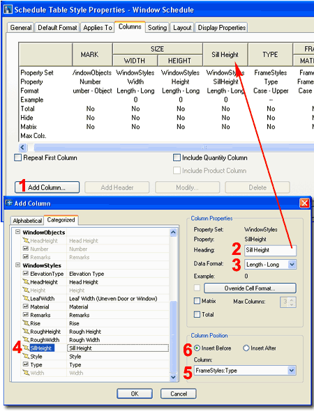 Modify the Window Schedule Table Style as discussed in this chapter and find the Columns tab as illustrated to the right. Use the Add Column... button to access the Add Column dialog box. On the Add Column dialog box, illustrated to the lower right, Type a Heading title for your Schedule Table Column ( something like "Sill Height"), set the Data Format for an appropriate way to display your heights ( such as Length - Long ). Find and Select the SillHeight Property Definition on the Categorized tab under WindowStyles as illustrated to the right. Use the Column pull-down list to Select the Name of the closest Column relative to where you want this Sill Hight Column to be placed and then use the Insert Before or Insert After radio button to set the side. If you make a mistake on the position of the Column in the Table, just use your cursor to drag the Column Header to the new position.