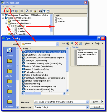 ![]() Illustrated above, I show how you use the Style Manager, filtered for Area Styles, to Open the Area Style template file from ADT's Styles folder. The process is much like Opening a drawing for editing. |