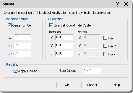 dialog Illustrated to the right I show the Anchor dialog that you will see when using the Volume Anchor option. This Anchor dialog is identical to that used for Cell Anchors. Keep in mind that thought this dialog is the same for the 2D Grid, some setting apply to three dimensions. The Resize and Size Offset options, for example, affect all three dimensions of Mass Elements. See comments under Cell Anchors for more information. |