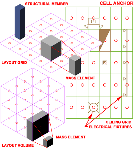 Volume Anchors are the most specific Anchors in the set of Anchor Tools because they only work with 3D Volume Grids. To me, the only reason to work with this grid type is for Massing Studies and thus it seems appropriate to use Massing Objects as well. Objects that are Anchored to a Volume Grid with the Volume Anchor will automatically be "Resized" to match the extents of one Volume Unit ( X, Y and Z ). Mass Elements, for example, will expand in all directions to match the dimensions of the X, Y and Z proportions. Some Objects, like Structural Members, only expand in the one direction that is free to become longer or shorter. Anchored Objects can be Moved or Copied freely within a single Volume Grid and will automatically Anchor to the next logical Anchor Position. |