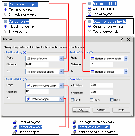 dialog Illustrated to the right I show the Anchor dialog that you will see when using the Curve Anchor option. Of all the Anchor dialog boxes, this one holds the greatest number of options and settings and is the one that you are most likely to encounter when working with other Objects in ADT; such as Doors, Windows, Walls and so on.