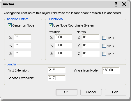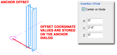 dialog Illustrated to the right I show the Anchor dialog that you will see when using the Node Anchor option. Since anchoring to Nodes is pretty straight forward, so too are the Anchor options. With this form of Anchoring, you basically have a connection between an Object and a Node. Though this method defaults to the Object's Node or Insertion Point, you can reposition it with the X, Y and Z Insertion Offset value fields. For Structural Members and Ceiling Fixtures, you may find that you will need to work with the Rotation angles ( Z-axis ) on a frequent basis since you cannot use the Rotate command to rotate Anchored Objects. If you need more options for positioning, take a look at the Curve Anchor discussed above. |