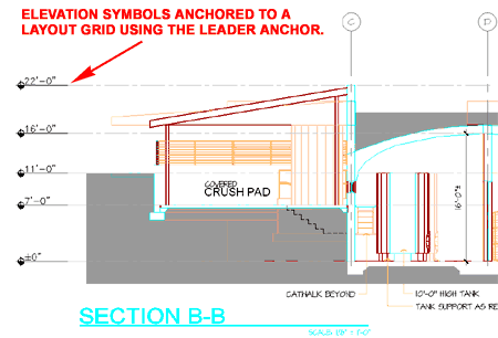 Leader Anchors offer the option to Anchor an Object to a Node with a connecting line or "leader". If you combine this feature with the power of the Layout Curve which can Add Anchor Nodes to just about any Object, you should be able to come up with some pretty interesting solutions for common drafting problems. Illustrated to the right I show how I often Anchor my Elevation Datum Points to a Column or Layout Grid that I use with 2D Linked Sections and Elevations. The Leader Anchor offers options for controlling the length and position of the leader tail so you can even move it out of direct alignment if space is tight. |