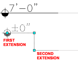 Illustrated to the left I show an example of an Elevation Datum with First and Second Extension Values. A straight leader has no Second Extension value but a bent one has two values as illustrated left and on the dialog, right.
