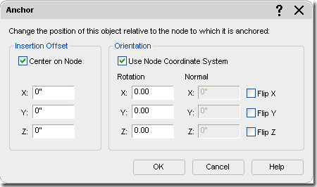 ![]() For 3D Volume Grids or Grids that have been Added under non-World UCS icon rotations, you may find the need to uncheck the "Use Node Coordinate System" so the Object being Anchored will align properly with the Grid. Working with Normals ( use 1" or -1" ) offers another method for rotating. |