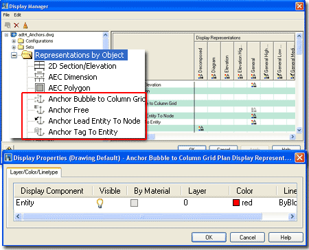 Display Component Illustrated to the right I show the four different Anchor Types that have their own Display Representations and some examples of where those Display Representations might be of importance to you. Generally the one Display Component that each Anchor Object has is set to "ByBlock" so you may never need to venture this deep to work this these settings. Anchor Bubble to Column Grid - this Display Representation allows you to control the Extension on Column Grid Bubbles as illustrated to the right. You may want to work with different Display Representations, such as Plan and Reflected to control the Lineweight, Plot Style or Color when switching between these two Display Representations. Anchor Free - this Display Representation is usually turned Off and as you can see from the example image, there is a good reason for that. The one place where you might find this feature rather handy is with Structural Members whose Normals are not the same as that of other Objects. This fixed size icon will display on all ADT Objects that have Anchors and are not Anchored ( Free ). Anchor Lead Entity To Node - this Display Representation is similar to the one for the Anchor Bubble Column Grid. It provides the means to control the leader line between Objects that have been Anchored with the Leader Anchor and their target. |