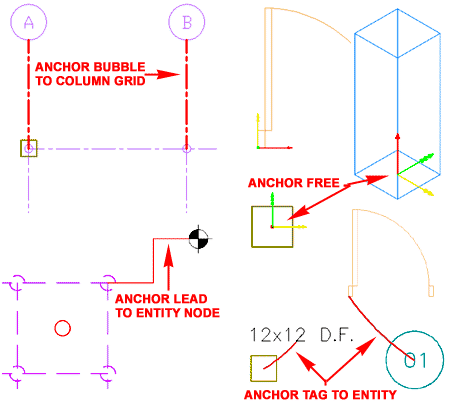 Though Anchors aren't physical objects that you can manipulate in ADT, they are objects with display characteristics. I do find it interesting that once you display your Anchors, you can actually select an object by picking on its anchor; meaning that Anchors are actually physical objects, we just can't manipulate them. There are four types of Anchors that you can display: Bubble, Free ( illustrated, left ), Leader and Tag. |