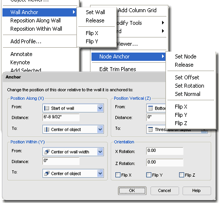 - menus and dialog boxes Anchors, anchors, anchors everywhere. Illustrated to the right I show three different examples of where you are likely to encounter Anchors. As discussed above, not all Anchors are equal and you should not let me confuse you about the Anchor Tools and Anchors in general but I do want to make you aware that they are virtually ubiquitous in ADT. Having a solid understanding of anchoring whether it is how a Door sits in a Wall or how a Column can be fixed to a Column Grid Node is a big part of mastering Architectural Desktop. Most users of this program tend to work graphically and often avoid venturing into dialog boxes such as the Anchor dialog illustrated to the right. The problem with this approach and attitude is that some technical problems just can't be solved effectively by working with Grips or or other graphical devices. In the case of a Door or Window in a Curved Wall, it can be incredibly difficult to accurately position these Objects along a Curve. Students often get frustrated in my classes as they observe an Object bounce to one side or another but never right to the location they want; even when using OSNAPS. If you Select an Object that is Anchored to something like a Wall, you should find the Anchor dialog on the Properties Palette for the Anchored Object. By working with the various Position settings on the Anchors dialog, you can take extremely accurate control over where Objects reside. |