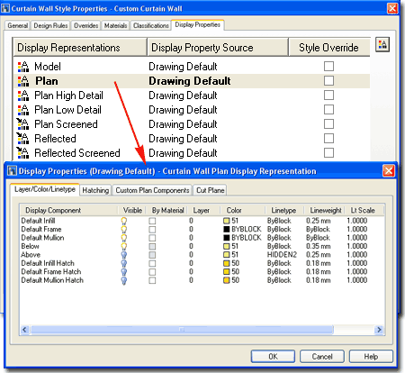 The Display Properties tab of the Curtain Wall Style Properties dialog box, illustrated right, provides access to a set of Display Representations similar to those found for Walls. Keep in mind that in addition to the Display Properties for the Curtain Wall you can also control the Display Properties of the Objects you use as Infills by working with their own Style Properties. In other words, the Curtain Wall only provides control over its short list of Display Components ( Infills, Frames and Mullions ) while Doors and Windows or other Inserted Objects are managed by their own Display Properties.