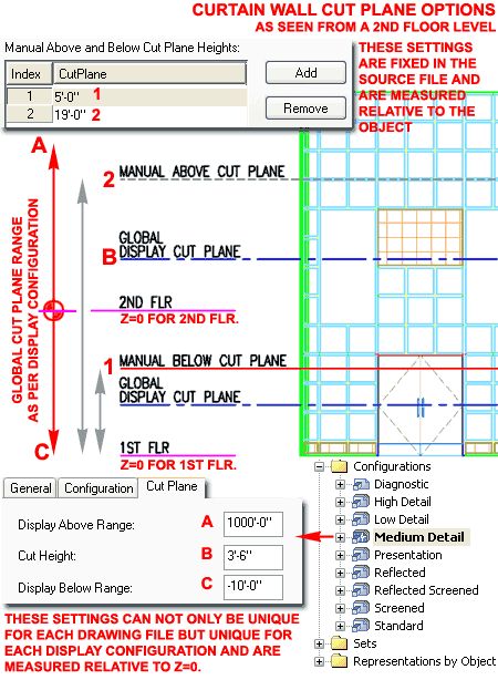 Curtain Walls Spanning Multiple Floors (Levels) - Elevation From a designer's point of view, creating one Curtain Wall Object that is used for many floors is far easier to manage than replicating work on each floor as separate Curtain Wall Objects. From the view on a Construction Document, the important thing is that the correct linework is illustrated for the Curtain Wall at each floor. Attempting to get both is not always easy and at times I have used one Curtain Wall Object as a master for Elevations, Sections and so on while using special replicas on each floor drawing that produces the desired linework I must have on my CD's. This may seem ridiculous but it may also be necessary given the limitations of Cut Plane controls on Curtain Walls when spanning floors. Assuming you are using one Curtain Wall Object and Xref'ing it into multiple floor plan drawing files, the worst setting you can tinker with is the "Override Display Configuration Cut Plane" because that will fix whatever "Cut Plane Height" you set in the source file for all of the other files you Xref the Curtain Wall into. Unless you take the time to create unique Display Representations and unique Display Configurations that can then be used as Display Overrides on Xref'd Curtain Wall Objects, you have to work with the current Display Configuration Cut Plane Ranges and Manual Above and Below Cut Plane Heights. Illustrated to the right I show an example Curtain Wall Object in Elevation and how two Manual Cut Plane Height Settings are read relative to the 2nd Floor. Keep in mind that when you use the Project Navigator tool, it automatically drops the Curtain Wall down relative to the Z-axis establishing a new Z=0 Cut Plane point ( base of 2nd Floor Z-axis = 0). If you work with Xref's manually, make sure to Move your Curtain Wall down in the Z-axis to the appropriate Floor Line position. The current Display Configuration, illustrated lower right, affects how your Curtain Wall is displayed relative to Z=0. This is an absolute World Coordinate System value that cannot be changed. You can, however, move the Object relative to this value in order to change how it is perceived or presented but that's yet another story. You may find, as illustrated to the right, that the default Above and Below Cut Plane Ranges exceed what you want to display. You can change them but be aware that these ranges are Global for most Objects in the current drawing so setting the Display Below Range ( labeled as "C") higher than zero may not be such a great idea. These Range values can be used to exclude or include Manual Cut Plane values set on Curtain Wall Objects - see discussion directly below.
