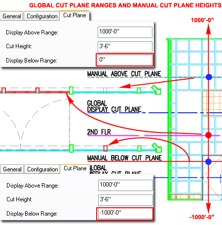 Curtain Walls Spanning Multiple Floors (Levels) - Plan Illustrated to the right I show how the "Display Below Range" of the current Display Configuration affects how the Manual Below Cut Plane value is displayed for a 2nd Floor Level Plan View of the same multi-level Curtain Wall example discussed above. By setting the "Display Below Range" value to zero, the only components that are displayed as Below the Cut Plane are those that fall between the Cut Height and the Floor ( assuming it is at Z=0). By setting the "Display Below Range" value to a huge negative number ( essentially negative infinity), the Manual Below Cut Plane value set on the Curtain Wall Object is now used to determine the components that are to be illustrated as Below the Cut Plane. Obviously a similar result can be achieved for the "Display Above Range". Note: |