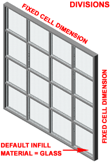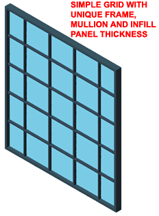 To create the simple Curtain Wall Style illustrated to the left, set the Horizontal and Vertical Divisions to use a Fixed Cell Dimension, specify that dimension, set desirable Widths and Depths for the Frames and Mullions and then set desirable Materials. By starting with a really simple example such as this one, you can work with different values and settings to see how they affect basic components. Once you start nesting layers of Grids, it gets a lot more difficult to visualize in your mind what you need to change in order to get desirable results. |