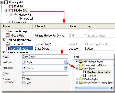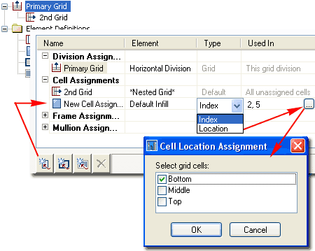 - Positions Starting back at the basic level of creating a custom Curtain Wall Style, notice how you can Add New Cell Assignments to the "Primary Grid" as illustrated to the right. Once you have more than one Cell Assignment, you should find that you will have the option to specify where the new Cell Assignment will be placed. Under the Type column look for the Index/Location drop-down list and select the option that is most useful for your desired result.