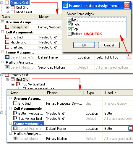 Because of how this example Curtain Wall Style was Divided, I show that I can now go to the Start or End Grid in the Tree View and put the Frame back. By repeating the same procedure to remove the Bottom Frame from the Primary Grid, I now Add it to the Sub-Grid by checking the Bottom button in the Frame Location Assignment dialog. Though I show that I have used the "Default Frame", there is nothing stopping you from creating a custom Bottom Frame proportion or shape and using it here. If you are following this example as an exercise, you will need to repeat these steps for the other side of the Grid. |