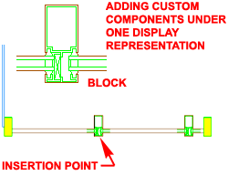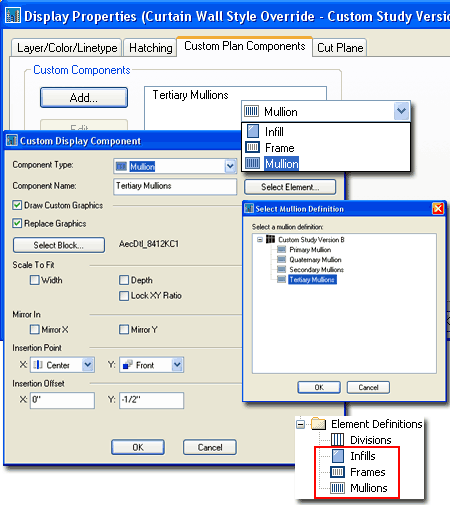 Properties - Custom Components Each of the Display Representations for Curtain Wall Styles offer the option to Add Custom Components by means of Attaching a Block. Only the Model Display Representation Properties dialog uses the "Other" tab for this feature while all other Display Representations use the "Custom Plan Components" tab illustrated to the right. Illustrated to the right I show how I have used the "Custom Plan Components" tab on the Display Properties dialog of the "Plan" Display Representation to Add... a Custom Block of a Mullion Section created earlier with the Detail Manager. By defining different Mullions for different parts of my Curtain Wall example, I was able to Select a specific Mullion type on the "Select Mullion Definition" dialog ( Select Element... button ).