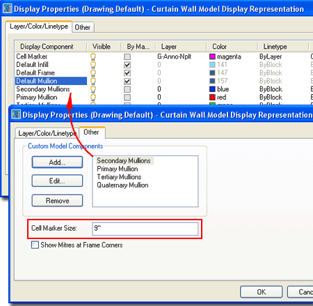 Display Properties - Other tab When you Add Custom Components for Plan or Model Display Representations, you also receive new Display Component Layers with names to match the Selected Component Name. Be aware, however, that these Custom Display Component Layers cannot be set to "By Material" and are thus relegated to basic Color and Linetype settings. Illustrated to the right I show the Display Properties dialog for the Model Display Representation. Notice that the Other tab offers the option to change the "Cell Marker Size" which is that little rectangle you see over Cells when editing in place. This Cell Marker is incredible useful when you need to Select Cells for such tasks as Merging or changing the Infill. |
