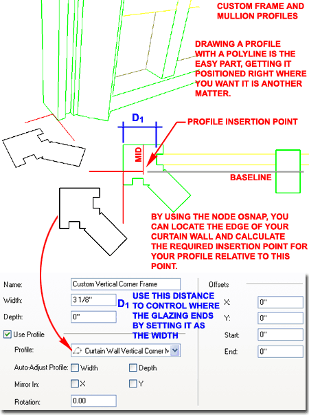 By the time you are this deep into customization chances are that you are well versed in the creating of Profiles but what might throw you for a tail spin is getting Frame and Mullion Profiles to site as you would like. Illustrated to the right I show the tedious process I had to go through in order to use a custom corner frame Profile for a Curtain Wall layout. Though you will find options for Auto-Adjust, Mirror, Rotate and Offsets, you can spend an hour fussing over these settings or you can start off on the right foot and save some frustration as I finally learned in this example. After drawing my corner Frame as a Closed Polyline, I positioned it right where I wanted it on my Curtain Wall end. Then by using the Node OSNAP I found the Baseline of the Curtain Wall and connected it with a perpendicular line off the Midpoint of my Frame edge as illustrated to the right. Once set I created the Profile Definition using this calculated insertion point and set it for a Custom Edge Frame as illustrated below right. Notice that I was able to avoid using Auto-Adjust, Mirror, Rotation and any Offsets. However, what did catch me by surprise what figuring out how the get the Glass or Panel Infill to stop right where I wanted it to in my Profile detail. By using the distance indicated as D1 in the image to the right, I got the Width value that I needed to set on the Frame Settings Properties View listed below right. Now, you are sure to have different design issues but hopefully this example will set you on the right path. |