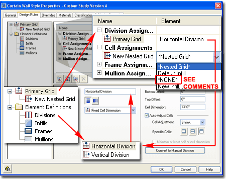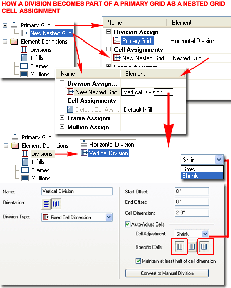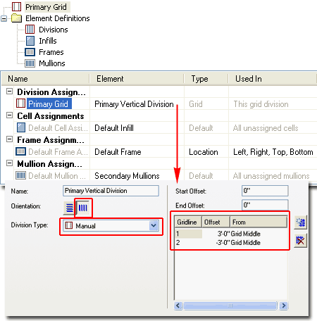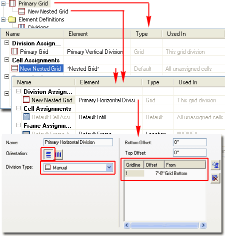 To make any new Division actually produce results in your Curtain Wall Style, you must use it as part of a Division Assignment. In order to Add new Division Assignments, you have to Add the *Nested Grid* Element as part of the Parent Grid's Cell Assignments ( in this case, the Primary Grid). In other words, you are declaring that for a particular Grid's Cell Assignment you want to set another Grid that has its own Divisions. Overview of Options and Settings The Name field is used by you to keep track of these potentially confusing nested grids but you can name them just about anything, like "1". The two Orientation buttons for the Grid Assignments ( Primary, Secondary, Tertiary and so on ) can be used at any point in the Curtain Wall design process and simply create horizontal or vertical Cells ( these are expressed as Mullions by default ). Division Type can also be changed at any point in the design process. There are four options for the Primary Grid and four for all other Grids that follow.