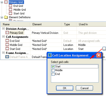 Design Rules - Locating Multiple Nested Grids By adding more Cell Assignments for the Primary Grid, as illustrated to the right, you should find the option to use the Index or Location dialog to specify the position of each Cell Assignment. There will always be one that remains set to "All unassigned cells". Illustrated to the right I show that I have added a total of three Cell Assignments to my Primary Grid and set each to a specific Location. I have also Renamed the Cell Assignments to match the Location for easier reading. Note: |