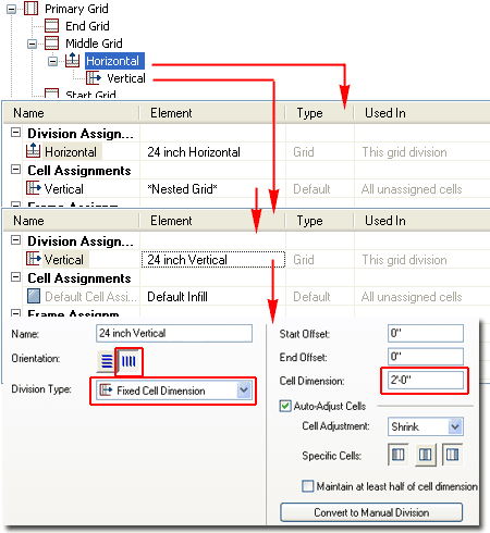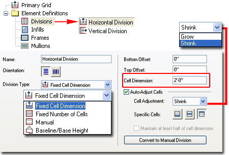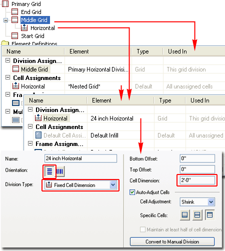 Illustrated to the right I show that I have selected the default "Horizontal Division" and changed the Cell Dimension to 2'-0" [610mm]. Though there are numerous other options to play with here, let's not worry too much about them until later so just confirm that you have an Orientation set to horizontal lines, a Division Type set to "Fixed Cell Dimension" and Cell Adjustment set to "Shrink". |
