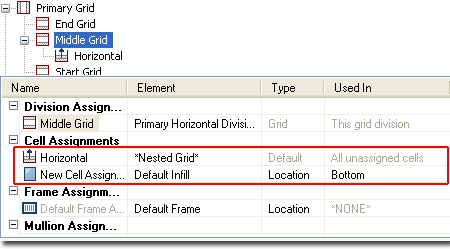 Design Rules - "Nest Grid" Cell Assignment From the Primary Grid, we can work with the three new Cell Divisions created above by Assigning a new *Nested Grid* to one or all three. Illustrated to the right I show that I have replaced the "Default Infill" Cell Assignment with the *Nested Grid* option. The default name for this new grid is "New Nested Grid" but in most cases, default Curtain Wall Styles will have this 2nd Grid named as "Secondary Grid".