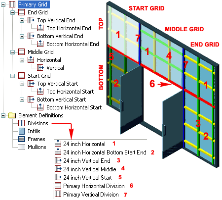 Design Rules - Completing a custom Grid System After you comprehend the steps taken above you should find that there is little more than extremely tedious redundancy for expanding those steps to a larger design solution. In the illustration to the right I show how I repeated similar steps used to create the Grid above the Doors to the create Grids for the Top Start ( Lower Left ), Bottom Start ( Lower Left ), Top End ( Upper Right) and Bottom End ( Lower Right ). You might argue that I have overdone the configuration but that all depends on the results you expect and how flexible you want the Style to be. I created a Lower Left and Right Grid Division in order to allow for Horizontal Mullions that can start at a unique height above the floor without affecting the entire Left Side; i.e., I isolated it to a Cell below the Door Head Mullion. You should also notice that I have a lot of redundancy but that was necessary to allow for Vertical Mullions to Shrink to the Right on the Right and to the Left on the Left |