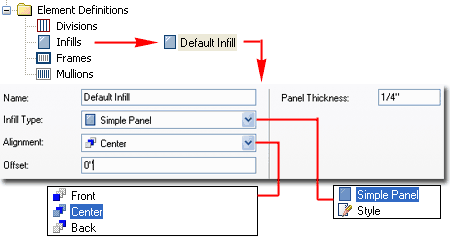 Notice that you can work with the three Alignment options ( Front, Center and Back) to describe how you want the Infill to be centered; i.e. relative to the Front of the Panel based on its Thickness, to its Center or to its Back. In addition to this Alignment you can use the Offset to push the Infill in the Negative or Positive direction ( even right out of the Grid ). |