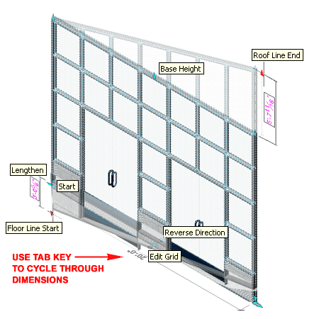 Curtain Wall Grip Points Curtain Wall Objects have several Grip Points that work just like they do on regular Wall Objects such as Lengthen, Start, End and Location. You will also find that Curtain Walls have Base Height, Roof Line Start and End and Floor Line Start and End Grips. The one Marker that is different from Walls is the Edit Grid option that allows you to work on the Curtain Wall Layout live in the Edit-in-Place mode. When you activate this Edit-in-Place mode, you will find a whole new set of Grip Point that you can work with - see discussion below for more on this subject.
