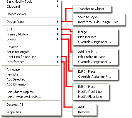Walls - Editing via Object Specific Pop-up menu Illustrated to the right is the object specific pop-up menu for a selected Curtain Wall. If you don't get the object specific pop-up menu when you select objects, check the Options dialogue box ( Type "OP" ) and look for two possible causes: 1) User Preferences tab, Windows Standard Behavior, Shortcut Menus in Drawing Area should be checked on on the Right-click customization dialogue box, make sure that Shortcut Menu is checked for Edit Mode. 2) Selection tab, Selection Modes, make sure Noun/Verb selection is checked. When you need to Modify a Curtain Wall in place, you actually have two choices. One approach has to do with using the Edit in place option and the other simply works on the principle of Overrides. When you use Edit in place, you get more tools, including the Overrides and the option to Discard changes or Save changes... with a different Style name. This means that if you want the best of all in place editing options, use the Edit in place option. I find that working directly with the Overrides often does the trick and thus I don't always go for the full set of Edit in place options. I also tend to forget that I have activated the Edit in place option and thus I keep getting the alert dialogue for Saving changes. If this stuff confuses you, you should consider beginning your Editing in place work by skipping down to the Cell Makers and Overrides topics below. These tools are the best for visual minded designers who prefer to work right on a 3D view of a Curtain Wall. They cannot, however, solve every need and thus you will eventually have to go back and work with the Styles. I do find that you can do quite a bit of work with these tools and often take a basic grid and change it dramatically. |