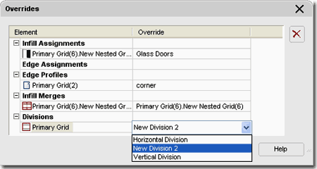 The Overrides tab will not offer anything other than the Override categories unless you have actually performed Override tasks and Saved them to the current Curtain Wall Style. Once you have made Override changes and used the Save Changes dialog box via the Edit in Place object-specific pop-up menu, then you will see those changes reflected here as illustrated to the right. Not only can you make more changes to overrides here, you can Remove them. To find out about creating overrides, read Section 5 - Modifying Curtain Walls |