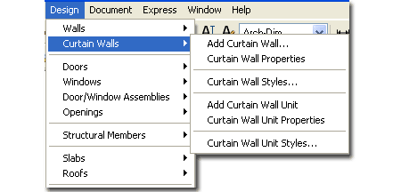 | Curtain Walls Toolbar How do I get this toolbar? You can also acquire access to these commands from the Alternate Design pull-down menu. From the Alternate Design pull-down menu, pick Curtain Walls > and cascade to the right for commands. |