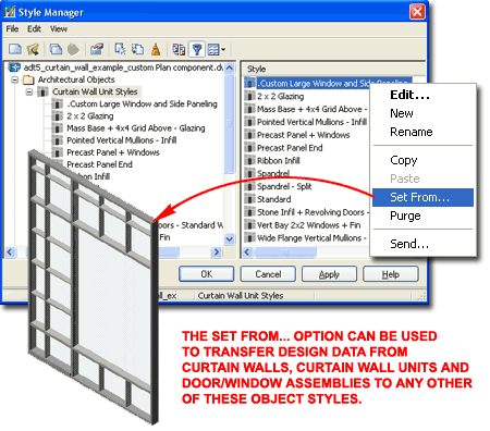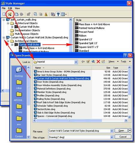 Illustrated above, I show how you use the Style Manager, filtered for Curtain Wall Styles, to Open one of the Curtain Wall Style files from ADT's Styles folder. The process is much like Opening a drawing for editing. |